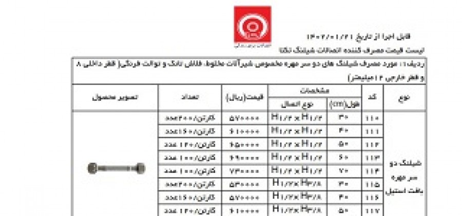 لیست قیمت اتصالات شیلنگی استیل استانداردی تکتا مورخ 21 فروردین 1402